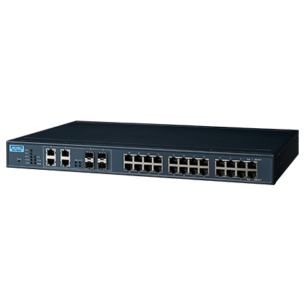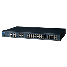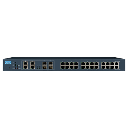 24GE PoE and 4G Combo Managed Ethernet Switch, IEEE802.3af/at, 19″ Rackmount, -40~75℃, 46~57VDC